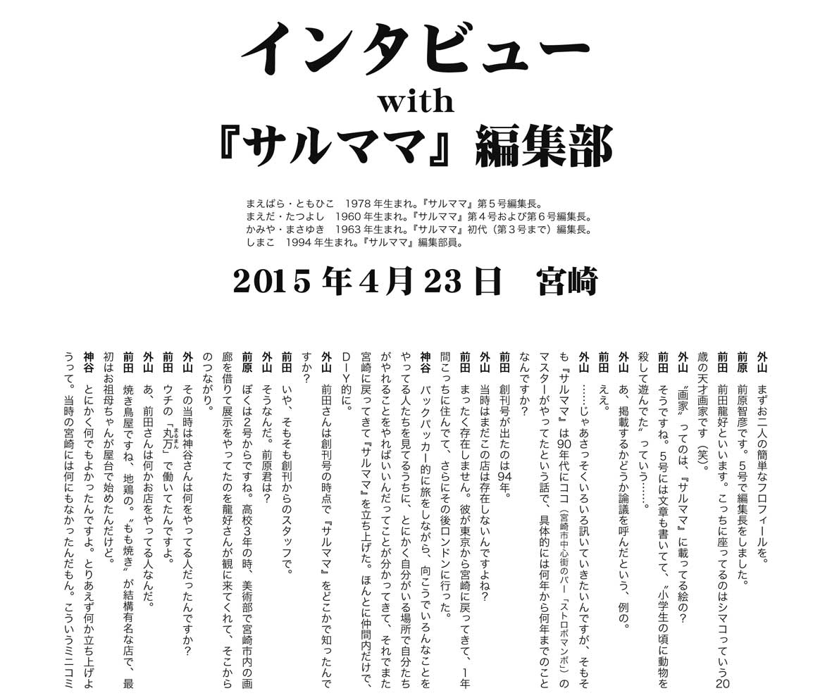 | 2015年の(とっても名誉ある)「外山恒一賞」を見事受賞した、とても宮崎くんだりで編集・発行されているとは思えない、全国どこに出しても恥ずかしくないどころかむしろ威張れるレベルの本格派サブカル系ミニコミ『サルママ』。もともと90年代に4号きり発行され事実上終刊していたものが、実に16年ぶりに昨年復活したのである。復活に至る経緯、地方都市で試行錯誤する志などについて聞いた。 |